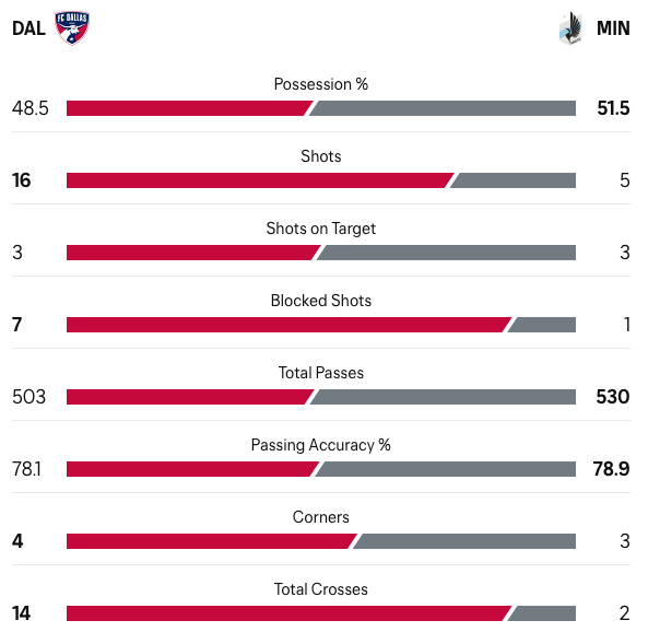 It’s not that FC Dallas didn’t generate opportunities - they had 16 shots on the night, 7 of which were blocked by shot stopper Drake Callendar. They had enough possession to make things interesting. Ultimately, though, even in the final third, both Petar Musa and Logan Farrington struggled - alongside their attacking counterparts. Once Minnesota stretched FC Dallas’ defense and got their goal, their game plan was simple - frustrate the home side. And that they did.